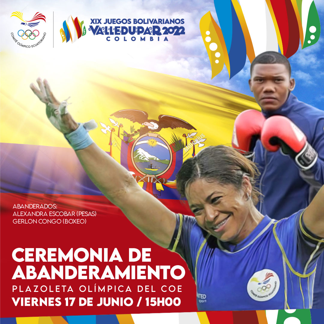 La Ceremonia de abanderamiento para entregar el Pabellón Nacional, que los tricolores portarán en el desfile inaugural de los Juegos Bolivarianos el 24 de junio, se desarrollará este viernes 17 de junio a las 15h00 en la Plazoleta del Comité Olímpico Ecuatoriano.