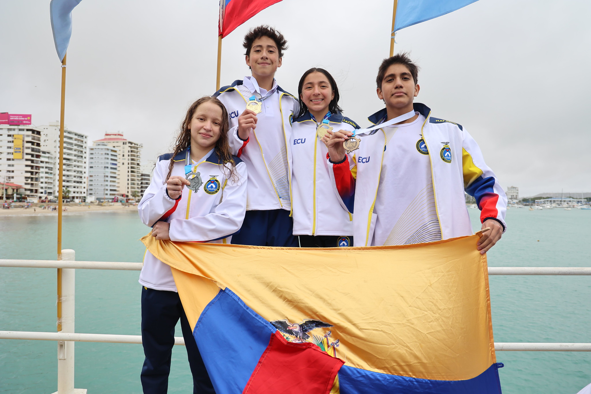 Juan Aguirre y Rafaela Coello se quedaron con el título de varones y damas en los 5 km categoría 14 – 15 años en la competencia de aguas abiertas que se desarrolla en Salinas hasta el sábado y congrega a atletas de 10 países. El país además levantó plata y bronce.