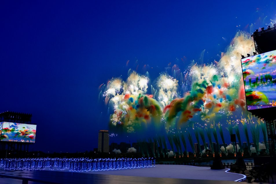Desde el principio, la iluminación, las coreografías y la música fueron protagonistas en un amplio espacio abierto. Con el cielo iluminado por los fuegos artificiales, tuvo lugar el desfile de las delegaciones.