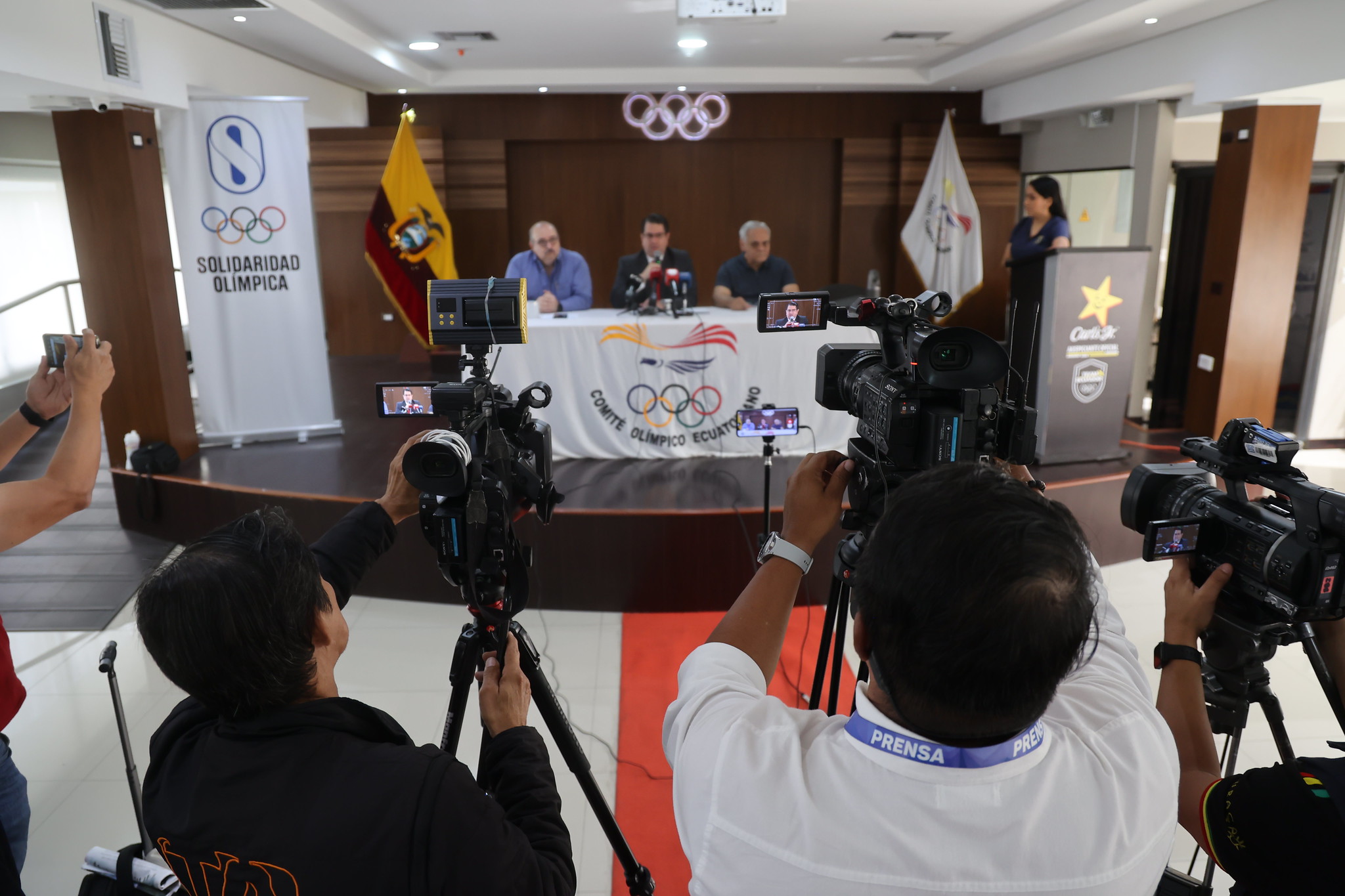El secretario general John Zambrano, el tesorero Fernando Ibáñez y el abogado defensor del Comité Olímpico Ecuatoriano Francisco Moreno brindaron este viernes 16 de enero de 2026, una rueda de prensa, donde se rechazaron los actos arbitrarios y bochornosos que se vivieron el pasado jueves 15 de enero, cuando personas identificadas con la Federación Deportiva del Guayas se tomaron de forma parcial las instalaciones de la entidad, en un acto de intervención al máximo organismo representante del Olimpismo en Ecuador.